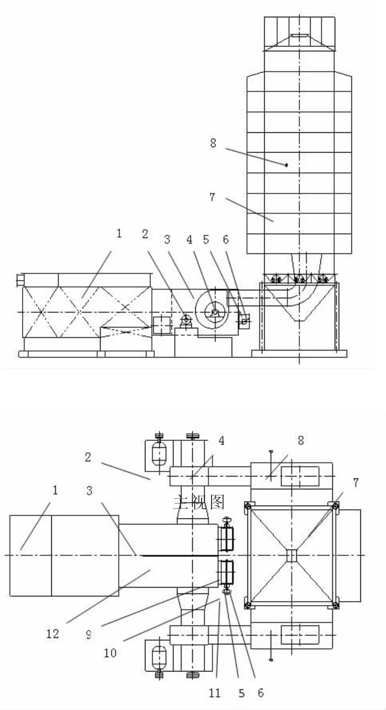 1.熱交換器;2.電機(jī);3.混合室;4.主風(fēng)機(jī);5.調(diào)風(fēng)筒;6.風(fēng)門(mén)板;7.種子干燥機(jī);8.溫度傳感器;9.閥門(mén)軸;10.聯(lián)軸器;11.電動(dòng)執(zhí)行器;俯12視.混圖合室中間隔板