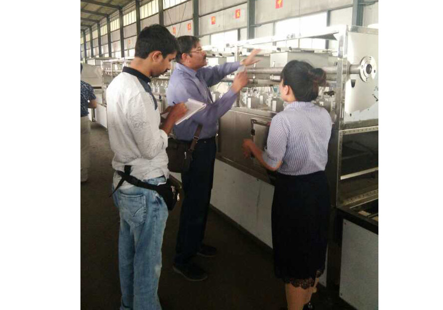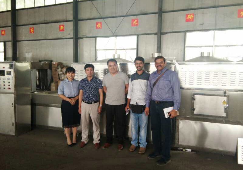 印度客戶在阿達(dá)森機械工廠參觀考察微波花生烘焙設(shè)備